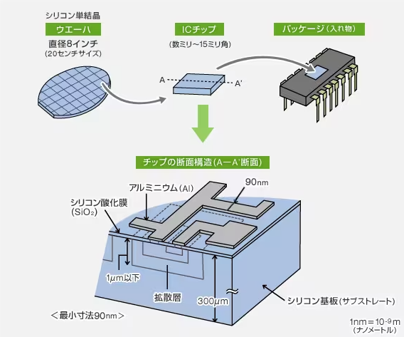 代表例はシリコン(ケイ素) - チップ:半導体を小さな板状に加工したもの。数mm角ほどの大きさで、ここに微細な回路パターンが描かれる。チップは金属の配線や保護樹脂でパッケージされ、私たちが見ている「ICの黒い部品」の形になります。